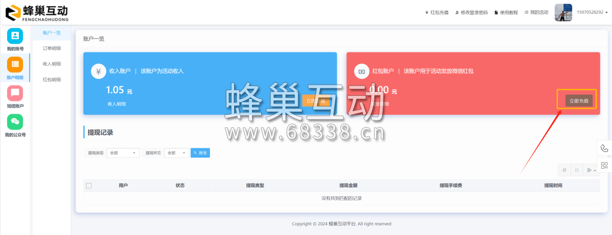 设置红包雨之前必须先充值金额充值入口在后台右上角位置