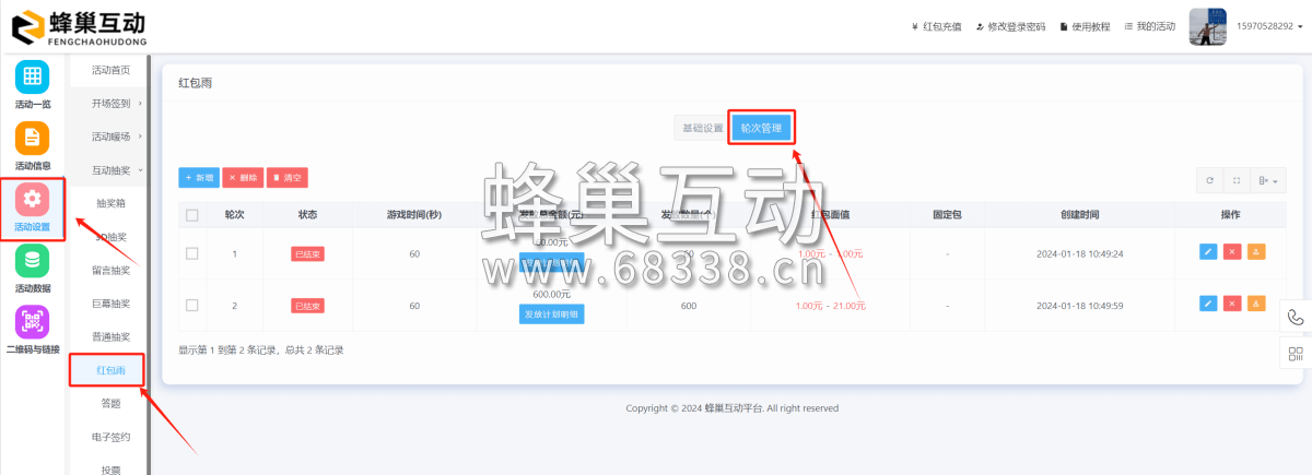 第一步:点击 功能设置或者活动设置---点击红包雨设置---轮次管理---新增。如下图: