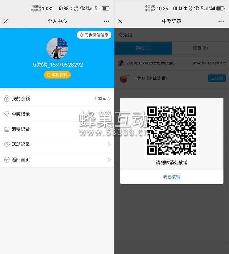 2.中奖人上台领奖让他出示核销二维码(手机端个人中心-中奖纪录-去核销中获取)